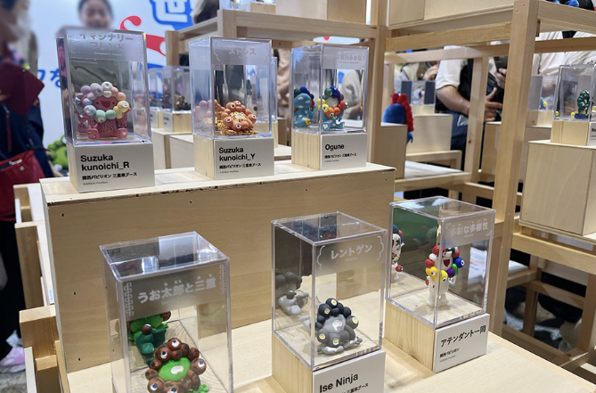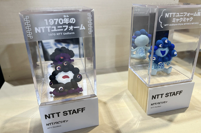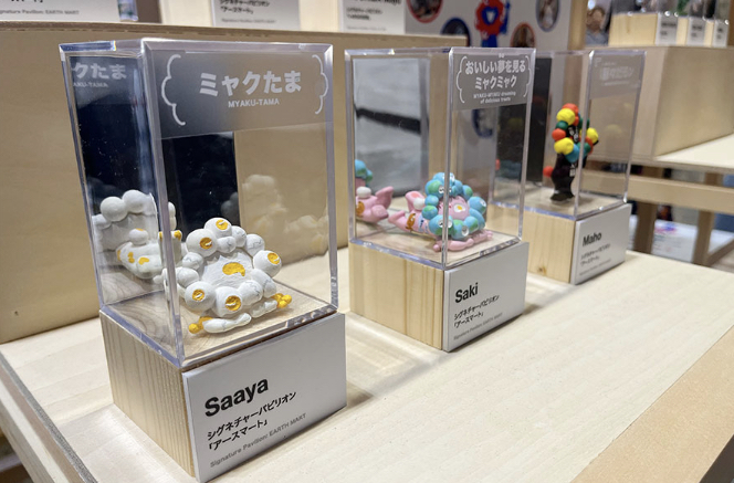 白いミャクミャクのフィギュアに世界の万博関係者がペイントした130体のミャクミャクが展示されています。