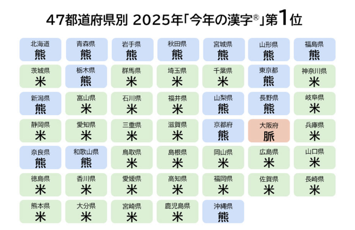都道府県別では「熊」とともに「米」が多く、二分されていると思いきや大阪だけ「脈」でした。