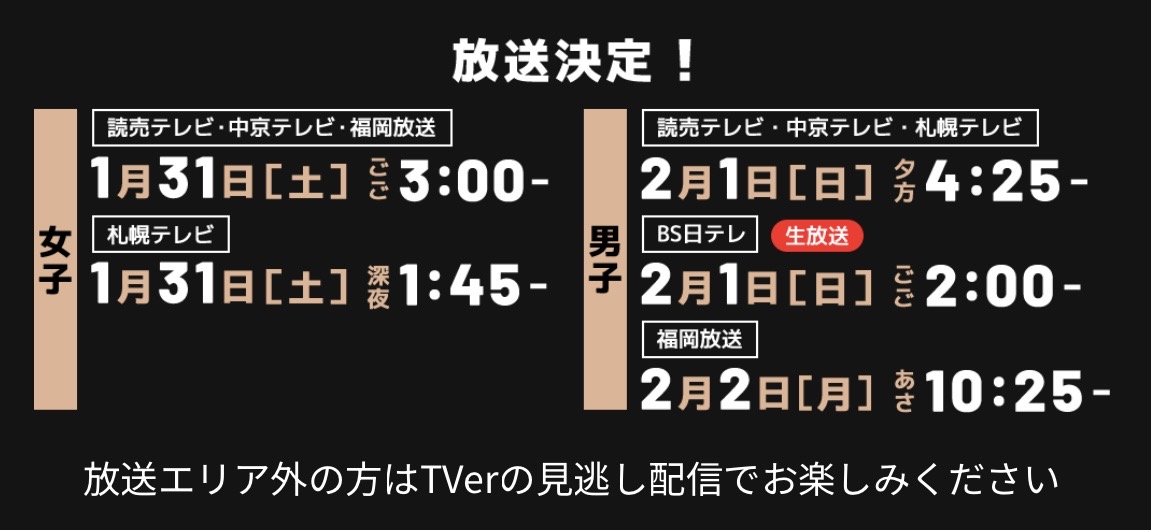 テレビでも地上波で放送予定ですので、会場に行けなくてもテレビで楽しめます☆